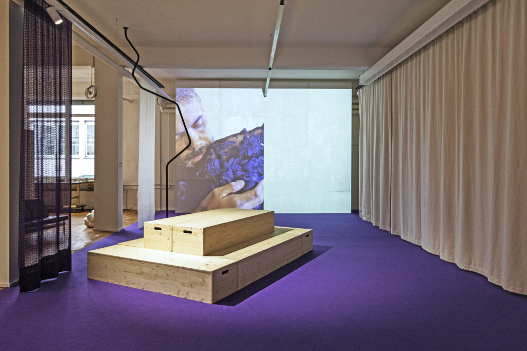 Auf große Banner gedruckt, begegnen die Objekte als Nahaufnahmen den Besucher:innen in der begehbaren Blackbox auf ihrem Rundgang durch den Raum wieder. Weiche Sitzelemente laden dazu ein, sich in die formlosen Textilkörper einsinken und umschlingen zu lassen. Verschiedene Motive und Fragen tauchen wie Echos immer wieder in der Ausstellung auf. Prägend für die künstlerische Praxis von Larissa Kramarek sind Videoinstallationen, mit denen sie auch für diese Ausstellung arbeitet. Zentrales Moment des Rundgangs bildet die Videoarbeit „about layers“ (2024). Im Fühlen und Erkunden der Kleider lösen die Grenzen der Individuen sich schrittweise auf. Aus den Bildern von konkreten Personen, die den Kleidern nachspüren, wird ein kollektives Moment. Geschlechterrollen und Körper verschlingen sich ineinander mit den Kleidern der Sammlung. Zwischen all den Auflösungserscheinungen finden die Besucher:innen keine klaren Antworten über das Verhältnis von Kleidern und Körpern, sondern sind eingeladen, sich lustvoll in den Wirrungen dieses multimedialen Knäuels zu verirren.