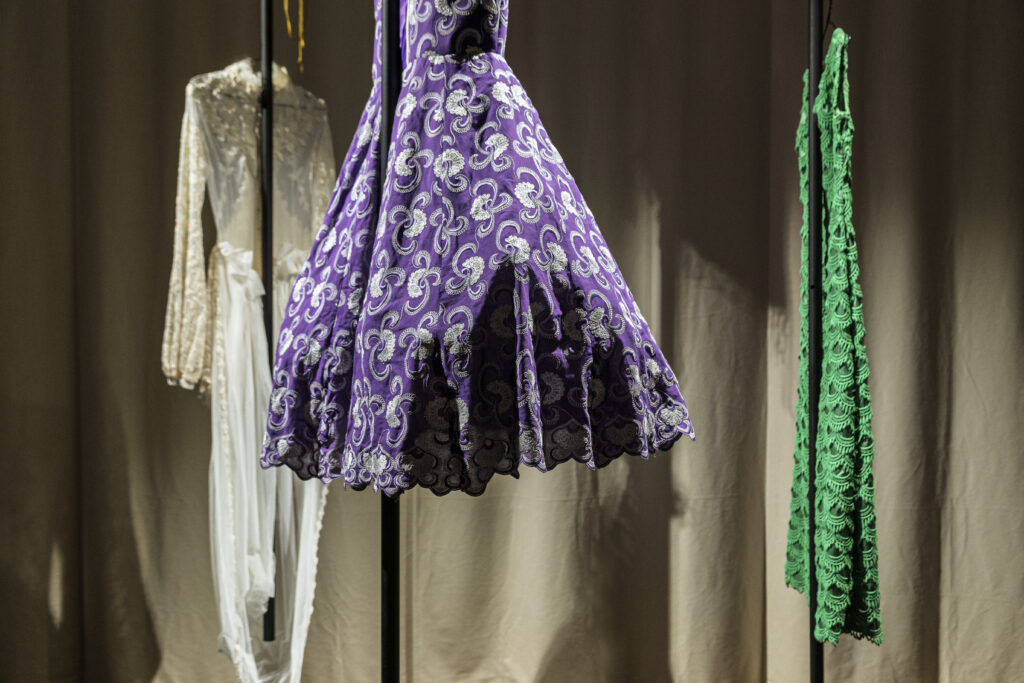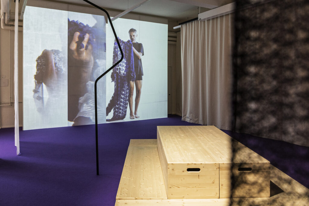 Larissa Kramarek eingeladen, sich künstlerisch mit den Archivbeständen der Sammlung auseinanderzusetzen. Ausgangspunkt der Ausstellung bildet eine Auswahl an Kleidern aus dem Archivbestand, mit denen die Künstlerin in eine intensive Wechselbeziehung tritt. Über den violetten Boden, der die multimediale Landschaft absteckt, können die Besucher:innen durch einen Parcours an Skulpturen, Videos, Archivstücken und Soundarbeiten flanieren und sich selbst in viele verschiedene Perspektiven hineinversetzen. Bereits beim Betreten fällt die Sitzinsel ins Auge: Ein Übersichtspunkt in dieser immersiven Topografie, die zum Verweilen einlädt und dem Publikum anbietet, sich über die Kopfhörer Geschichten anzuhören: Die Künstlerin hat für die Ausstellung Kolleg:innen gebeten, vor der Kamera und dem Mikrofon die Stoffe zu fühlen, sie eingehend zu betrachten und ihre Gedanken zum Thema Mode, Körper und Identität zu teilen.