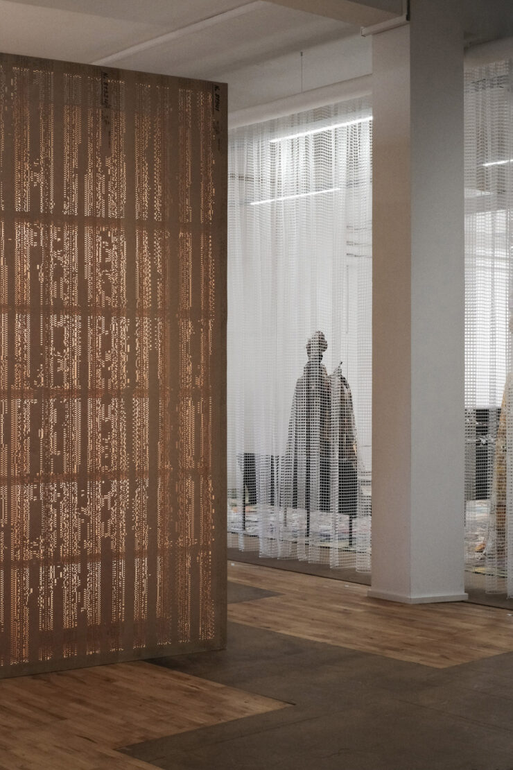 Ein besonderes Objekt der Schau ist ein mittig platzierter Kubus, der vollständig mit Lochkarten aus der Stickereiproduktionverhüllt ist. Aus seinem Inneren heraus beginnt er zu leuchten – ein poetisches Sinnbild für codiertes Wissen, Erinnerung und digitale Transformation im Textildesign. Die Lochkarte, ursprünglich ein Steuerungsinstrument für Stickmaschinen, wird hier zum künstlerischen Symbol einer Wissensspeicherung, die Vergangenheit und Zukunft miteinander verbindet.